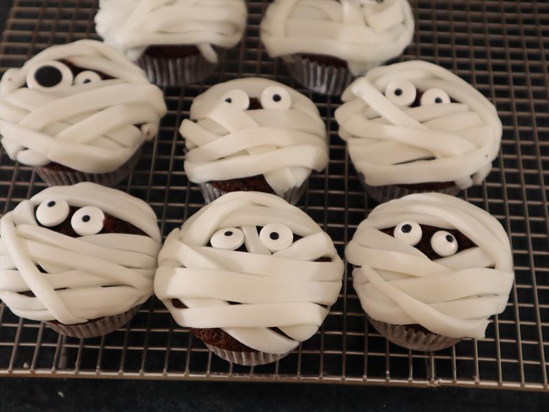 Fletjið út fondantinn og skerið í mjóa renninga. Leggið renningana yfir hverja köku og setjið augu til að útbúa múmíur.