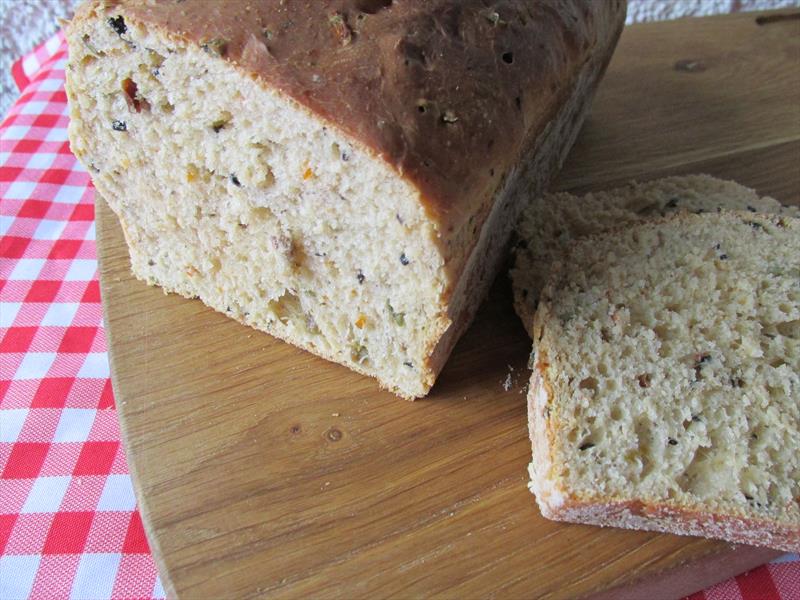 Leysið gerið upp í ylvolgu vatninu með sykri og látið standa nokkrar mínútur. Setjið þurrefnin í skál ásamt olíunni og bætið gervatninu saman við ásamt ólífunum, tómötunum og egginu. Hnoðið rólega í 2 mínútur, síðan ögn hraðar í 3 mínútur, eða þar til slétt áferð er komin á deigið.