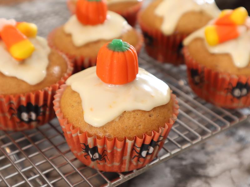 Leyfið kökunum að kólna og setjið síðan glassúr (og hlaup sem skraut ef vill).